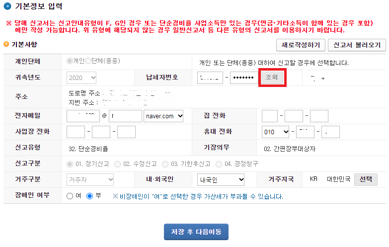 신고서 작성하기로 넘어가게 되면 기본정보 입력 화면이 나옵니다.