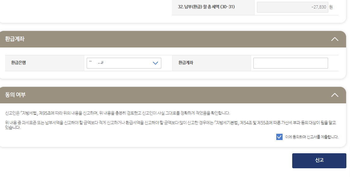 환급계좌 동의 여부 체크 후 신고를 진행합니다.