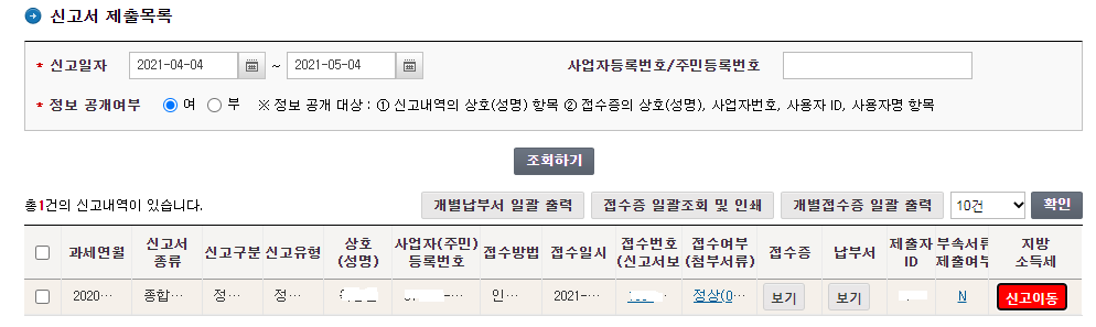 '조회하기' 버튼을 눌러주시면 방금 신청하신 신고서가 조회됩니다.